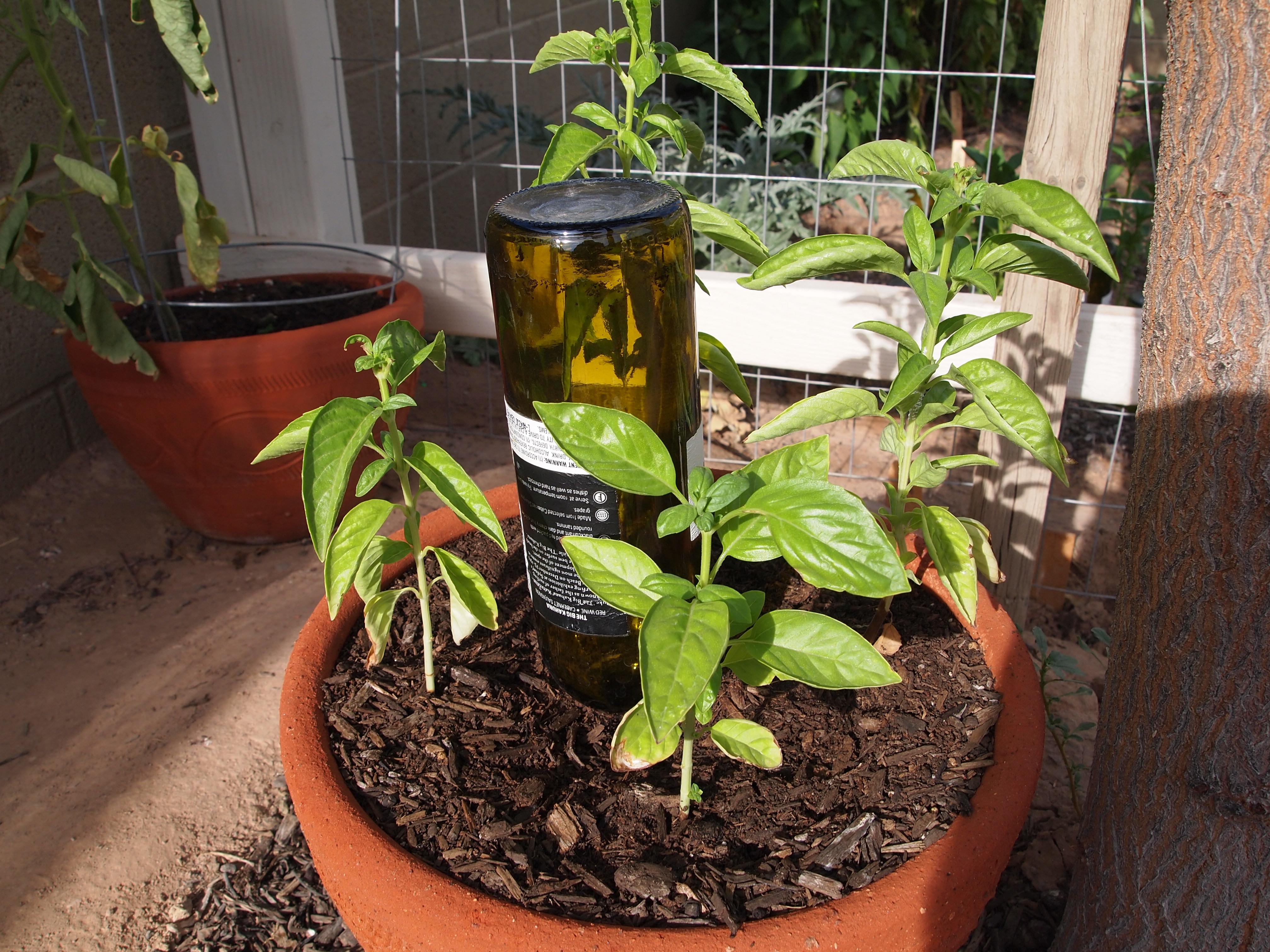 I go out each morning and check on the garden. The daytime temp is reaching 108-110, so I am heavily watering every other day. For my weaker plants I also fill up a wine bottle on the non-watering days and drive it into the ground next to the plant. This has been working well so far, especially for some of my containers. It looks a little weird, but it works.
