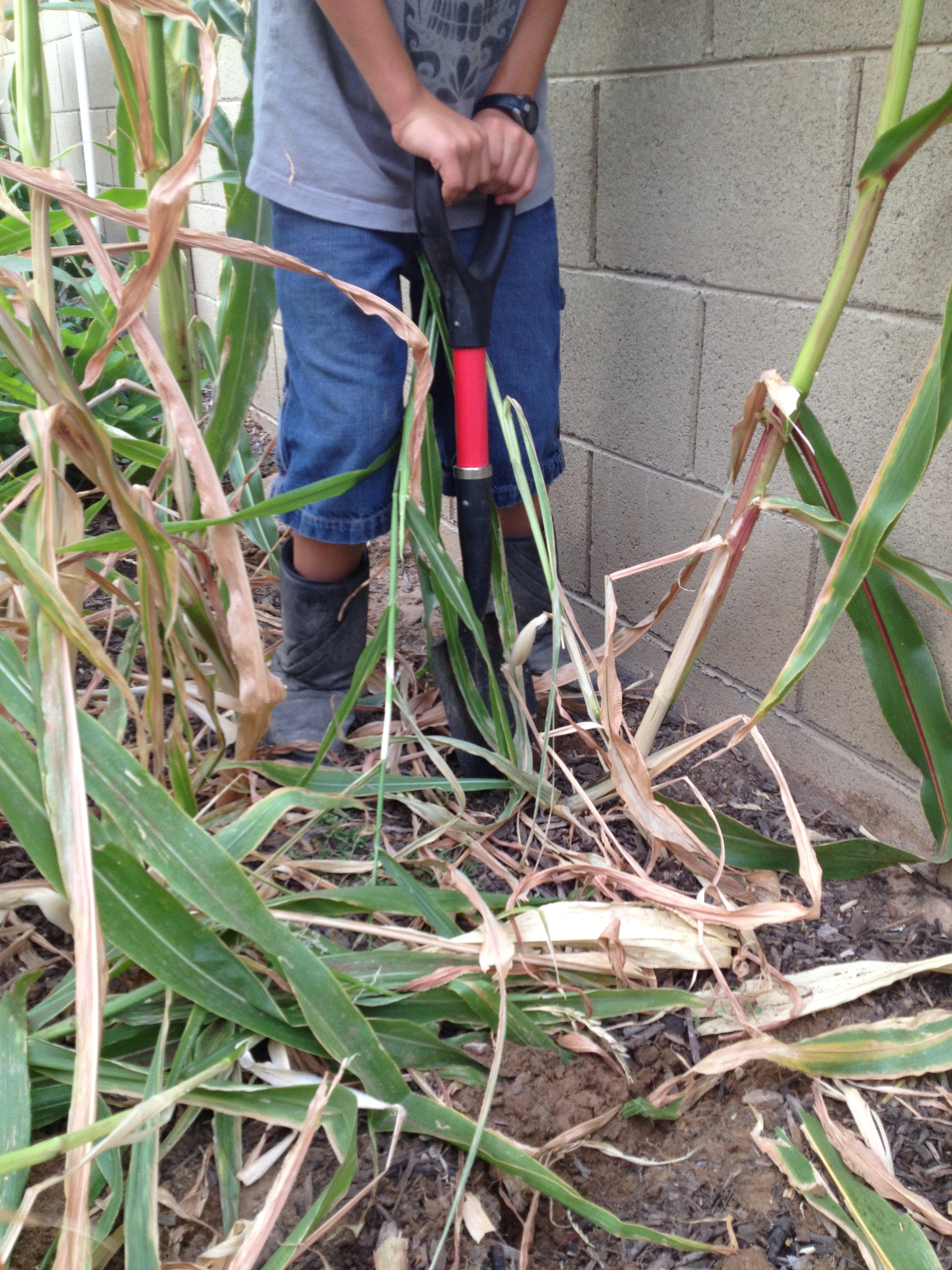 • Great thoughts, erikamay85! I planted the corn next to the wall because… well, that’s the only spot I had. I would have preferred the other side of my yard, but I have three citrus trees there. Since the corn was on the west side of the east wall they missed the cooler morning sun and were blasted by the afternoon furnace. Probably not the best scenario. They also got hammered by a strong west to east wind on several occasions.