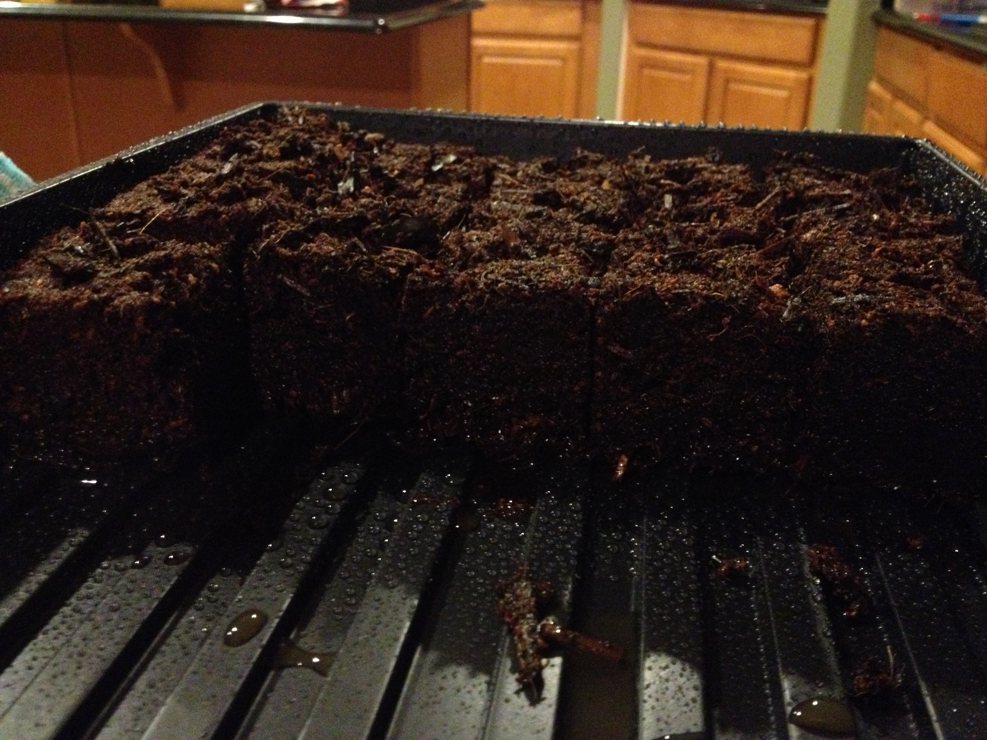 I should have sifted the compost to make it finer and eliminate the big pieces. I had hypothesized that these would help as a replacement for the vermiculite… I know a bit of a stretch… but they just make it too crumbly. That’s when wet, I don’t think that will get better as it dries. The big chunks also keep it from getting a good form. The blocks should be pretty much a solid square and this is more of a marshmallow cube; kind of rounded on the corners.