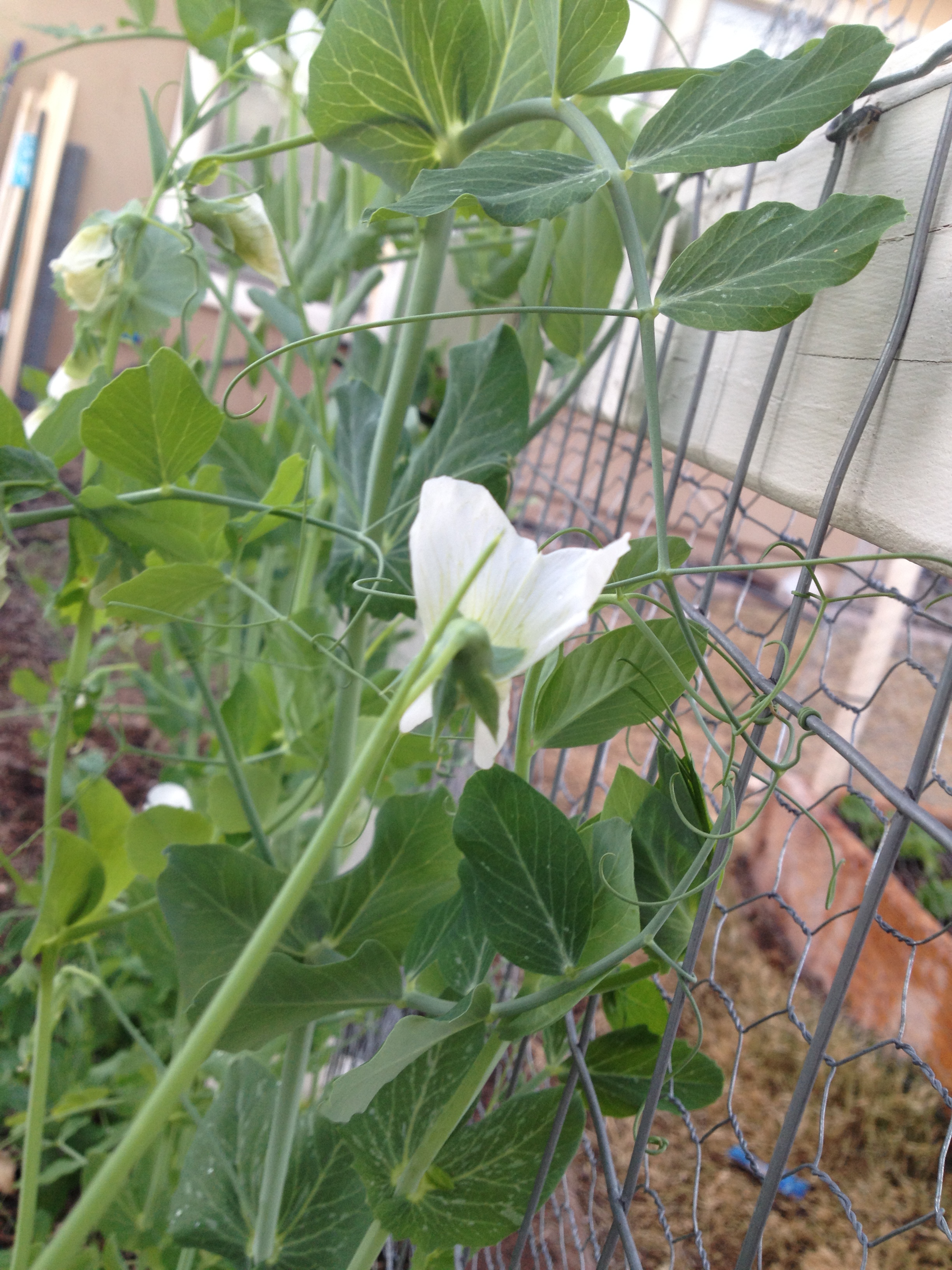 The peas are looking okay.  Haven’t gotten more than a handful yet and none actually made it into the house… ahem… but I’m still holding out hope that we’ll get some.  The chickens have been doing their best to get at them through the fence.  Just one more reason the ladies are going to get locked back up.  It’s kind of sad, but… necessary I think.  They have abundant room in their run, but I think they’ll squawk up a storm about being confined.  Of course they are squawking anyway, so no real change there.