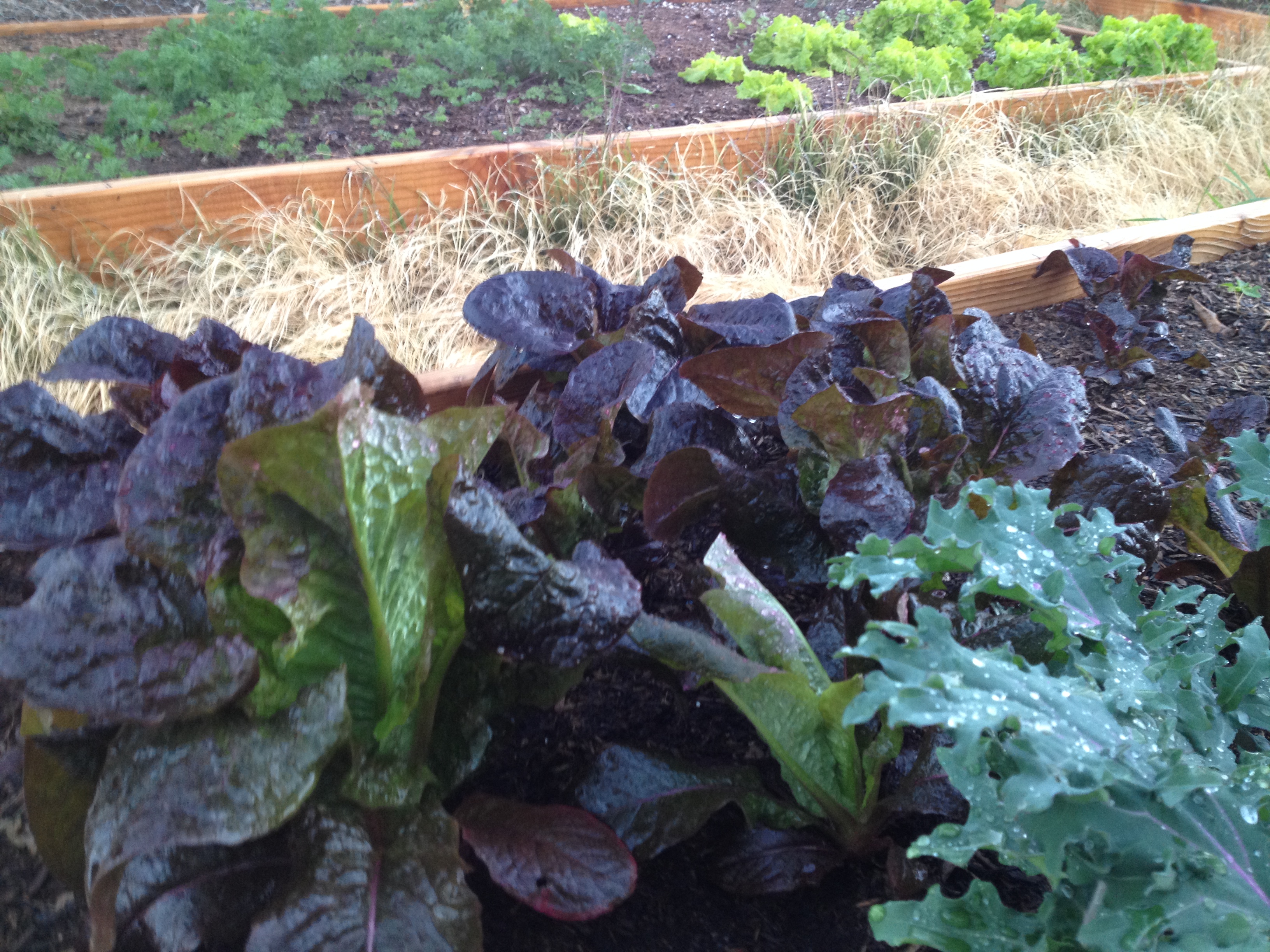Blurry picture trying to lean over the chicken wire and take it.  The purple/red stuff is red romaine.  Again, it’s been out of the light for quite a while, but some of it is close to being ready.