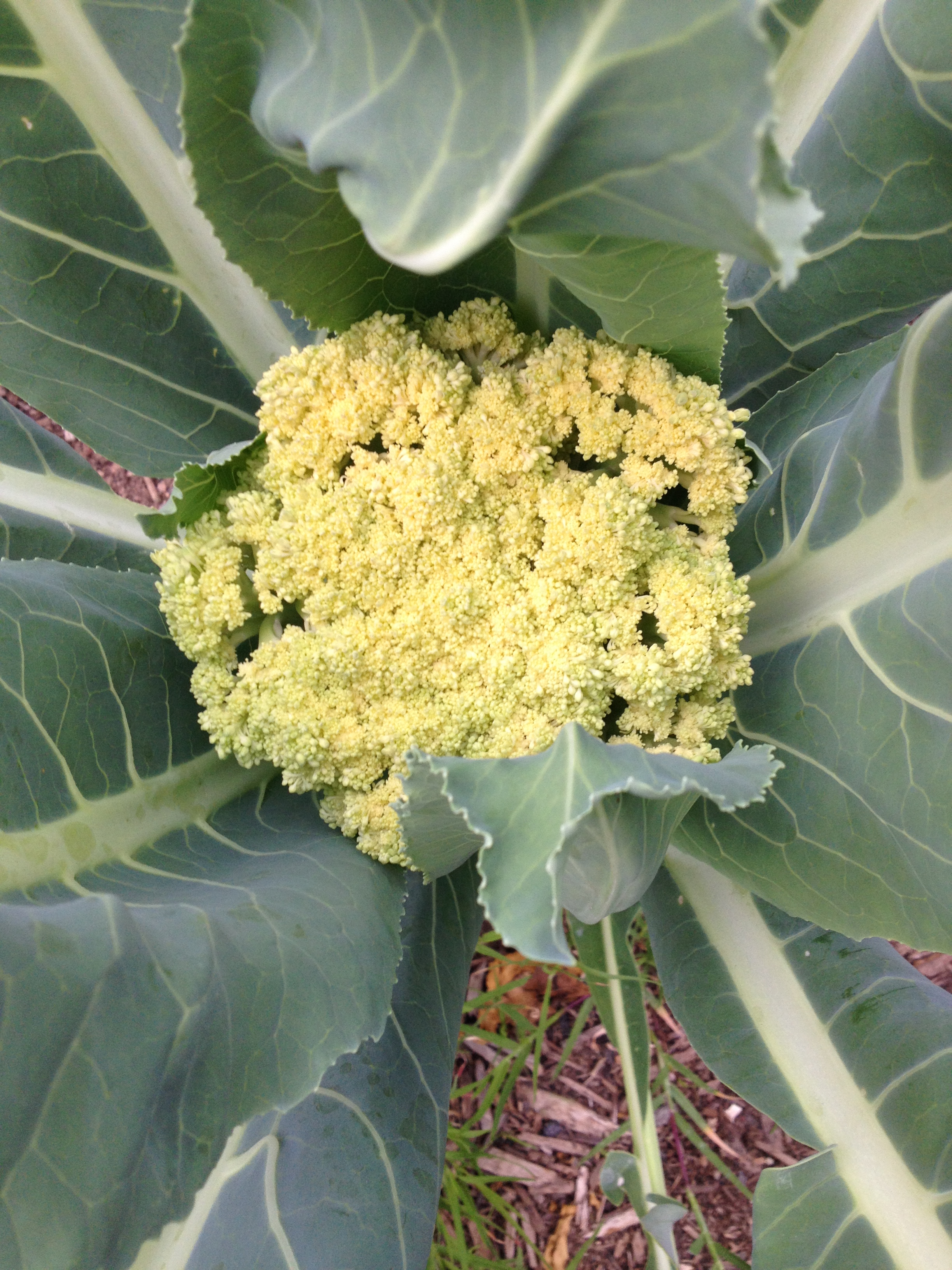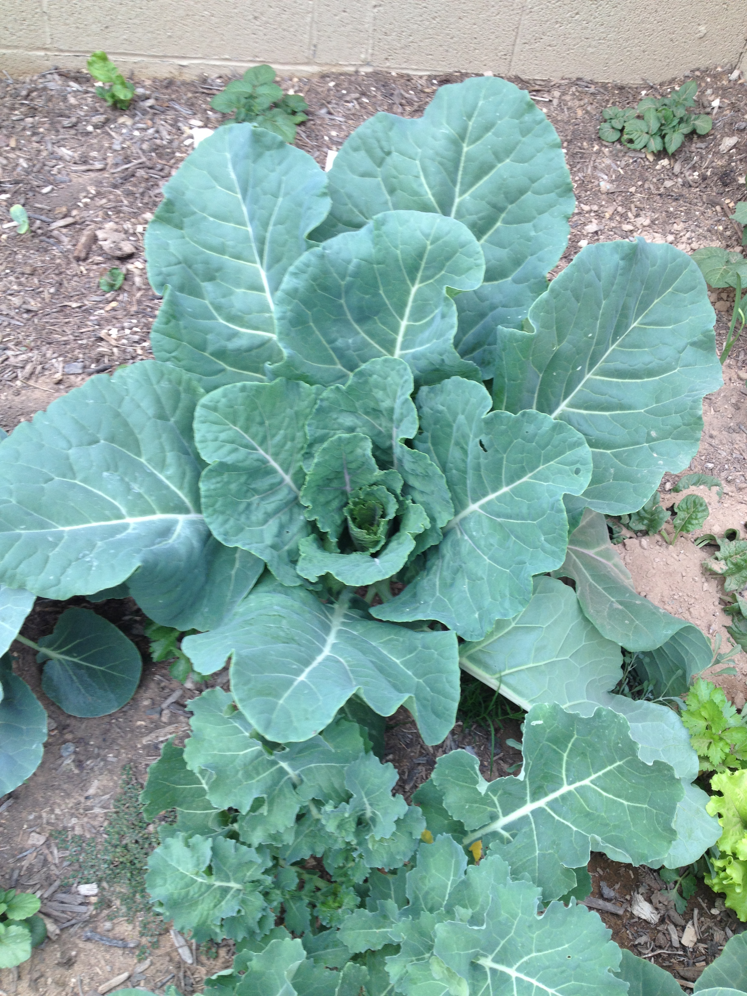 Cauliflower. Another first this year. It’s pretty yellow right now. I’m thinking it will lighten up as it gets bigger. Either way, it’s looking good. You can see a little bermuda growing at the bottom. The grass is already turning into a menace and popping up everywhere. It is just crazy. So I pull it and wait, then pull it again, and again, and again…