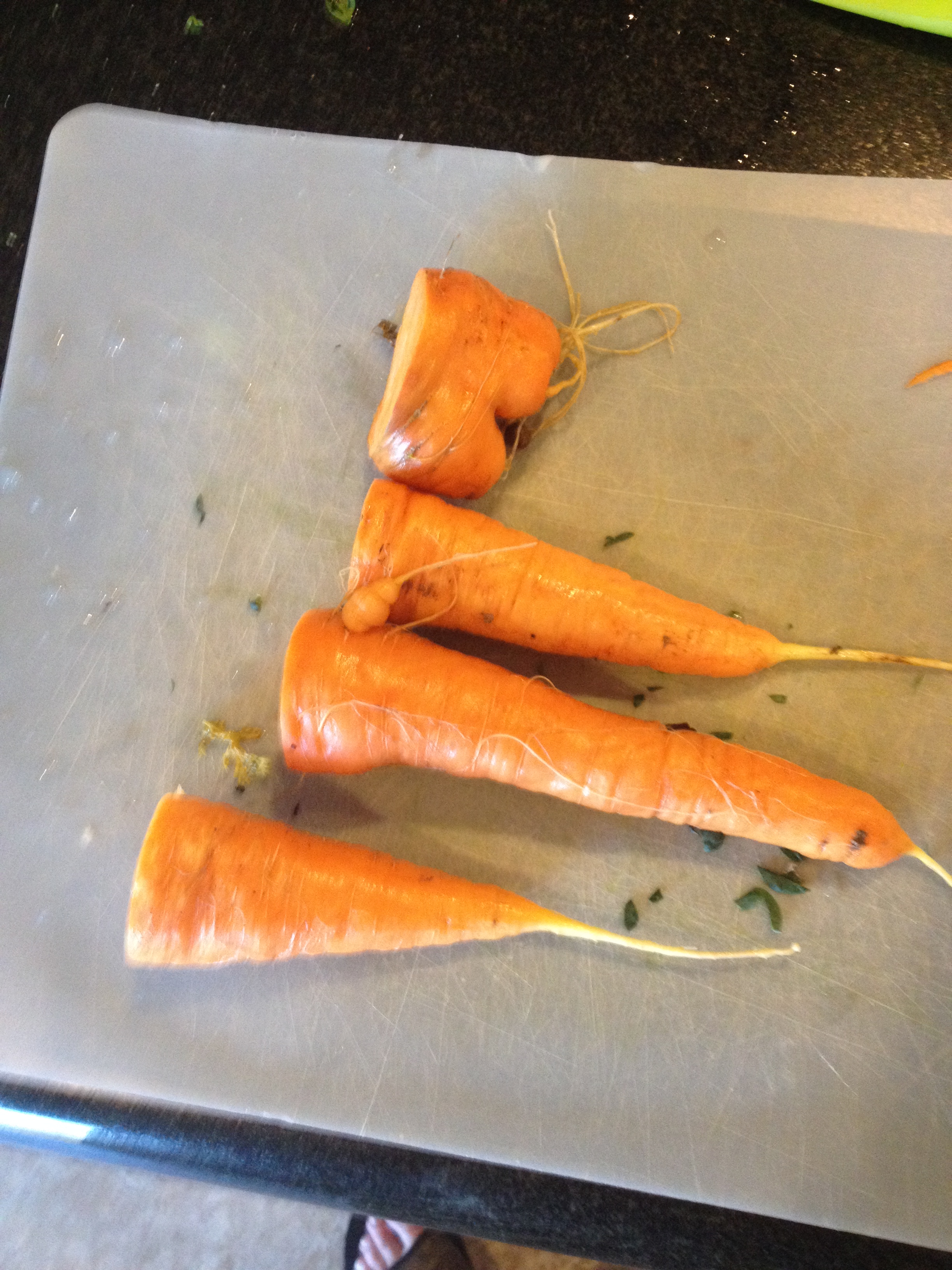 Now of course, even though I had some pretty carrots… they tend to have a mind of their own.  Their is no way to supervise the subterranean wanderings of the carrot root.  So sometimes, they come out a little strange.  The short stubby one at the top of the picture was dubbed, “the carrot butt”, by some dinner guests.  Nice.