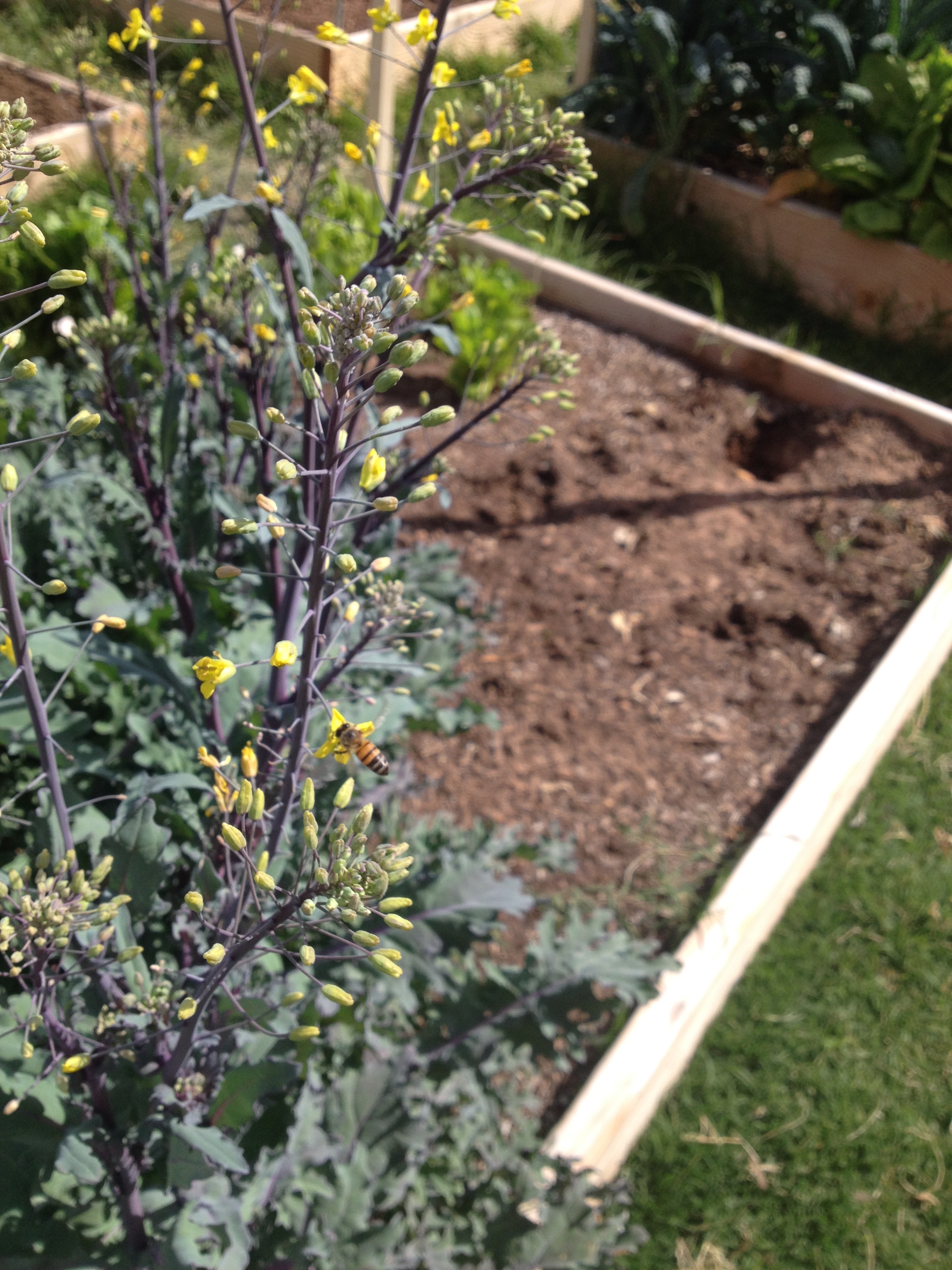 I was able to catch a couple of decent snaps of one of the many bees buzzing around my bolted dino kale.  Not bad considering it was all taken with my phone.