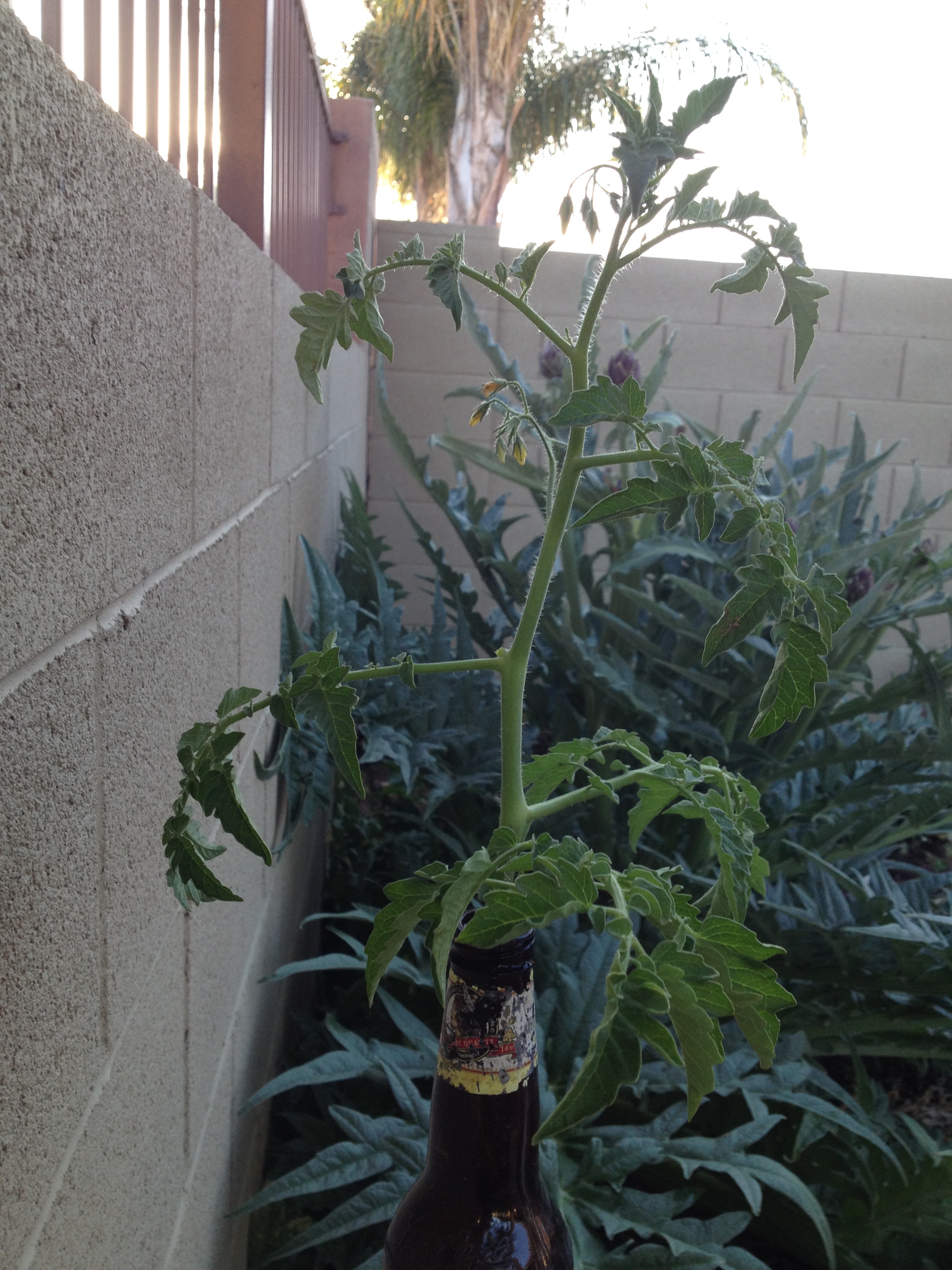 Just on a whim I took one of my longer tomato prunings and put it in a beer bottle with some water.  It’s been a couple of days now and is starting to develop some roots off of the stem.  I’m going to see how this goes.