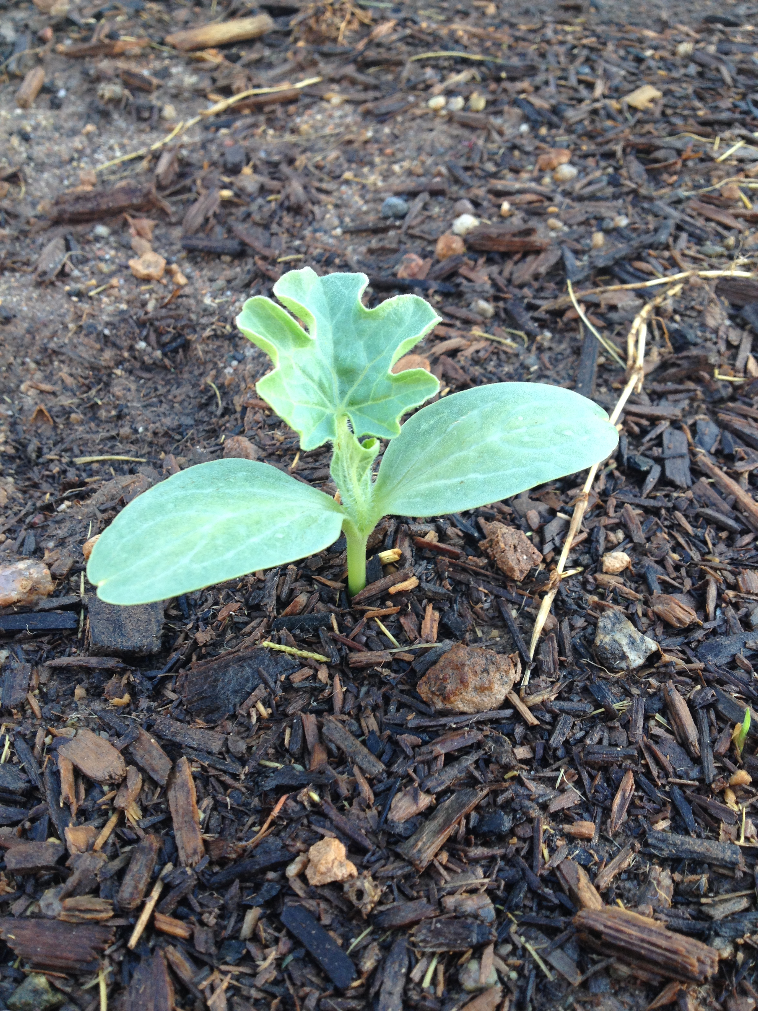 Charleston Gray watermelon coming through nicely.  Like the Desert Kings they have a lighter colored skin but are supposed to grow about twice as big with red colored flesh.  Yummy!