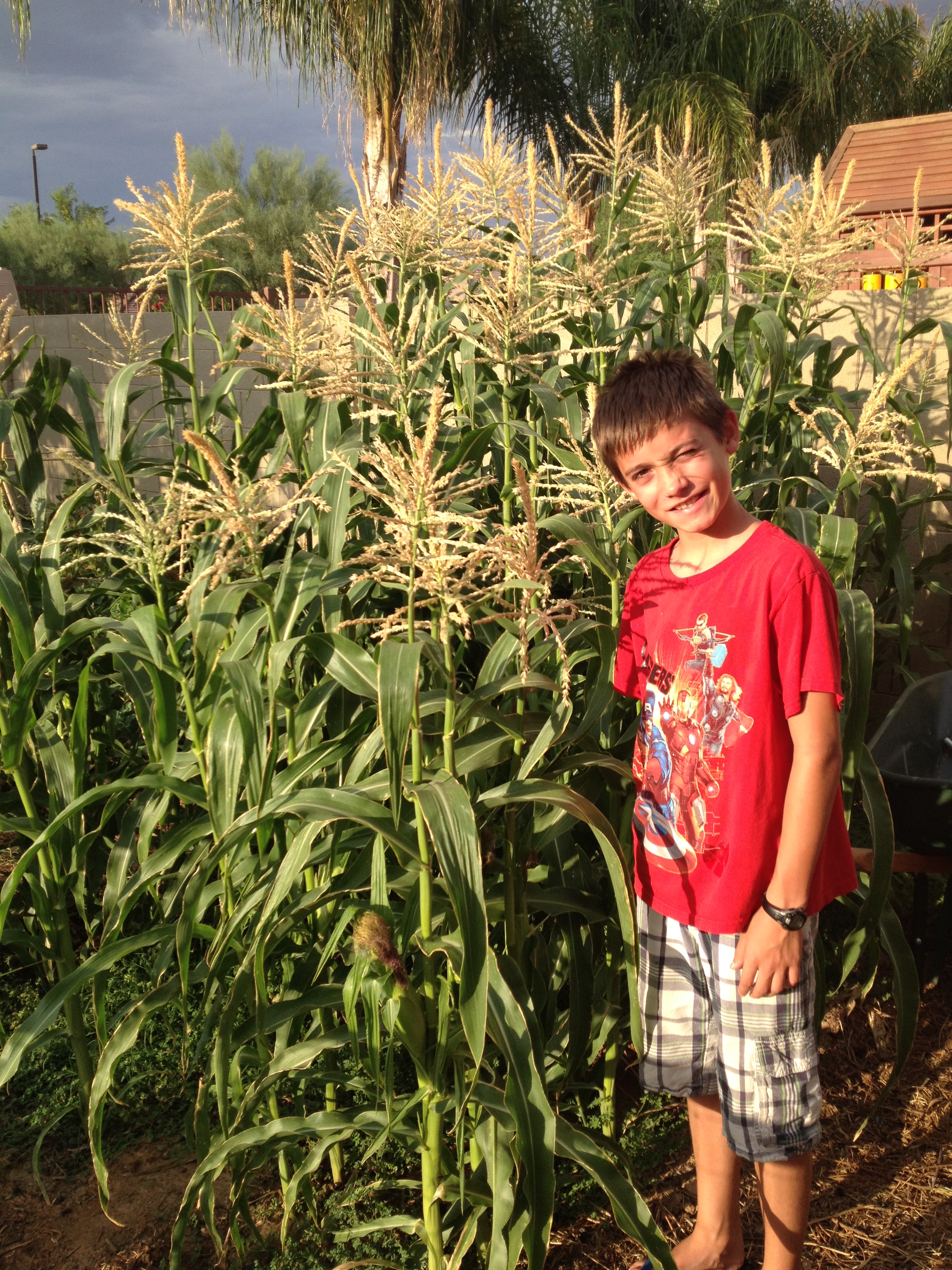 This is one of my four boys.  He’s 10 and tall for his age.  Most of the corn is over 6 ft, with some more than 7 ft.  The ears are plumping up nicely.  🙂