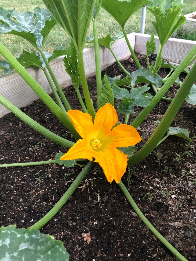 So far my squash are strongly tending toward the female. No male flowers yet and no neighbors with squash for cross pollinization so… no fruit yet. The flowers are very pretty though. No squash bugs noticed yet. Plants are looking good. Harvesting garlic too.