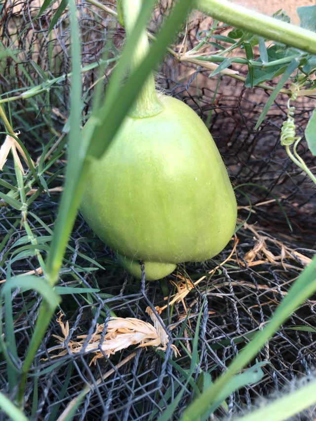 The watermelons are growing in number and size. I did run into a minor complication. The vines started to grow down the side of my house and have made there way into a roll of unused chicken wire. A melon started to grow and is now inseparable from the chicken wire. I’m reminded of people who have put watermelons in boxes to grow square melons. That is a bit intriguing to me…