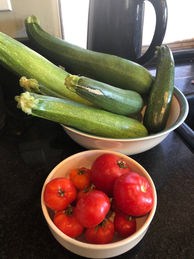 It happens every year about this time. I’m not sure how. I check the vines every day but somehow one hides. In the picture the yellow squash is a good harvest size. Again, not sure what happened with the zuke on the bottom. Oops. 🤣